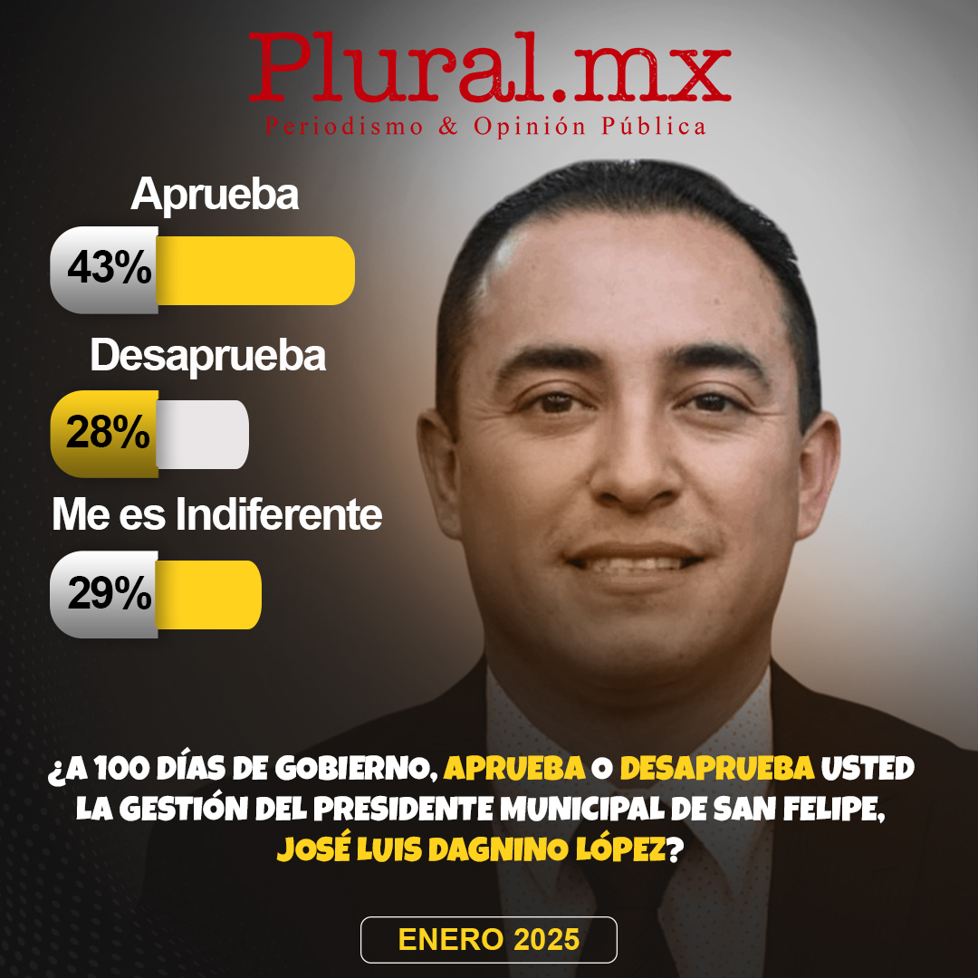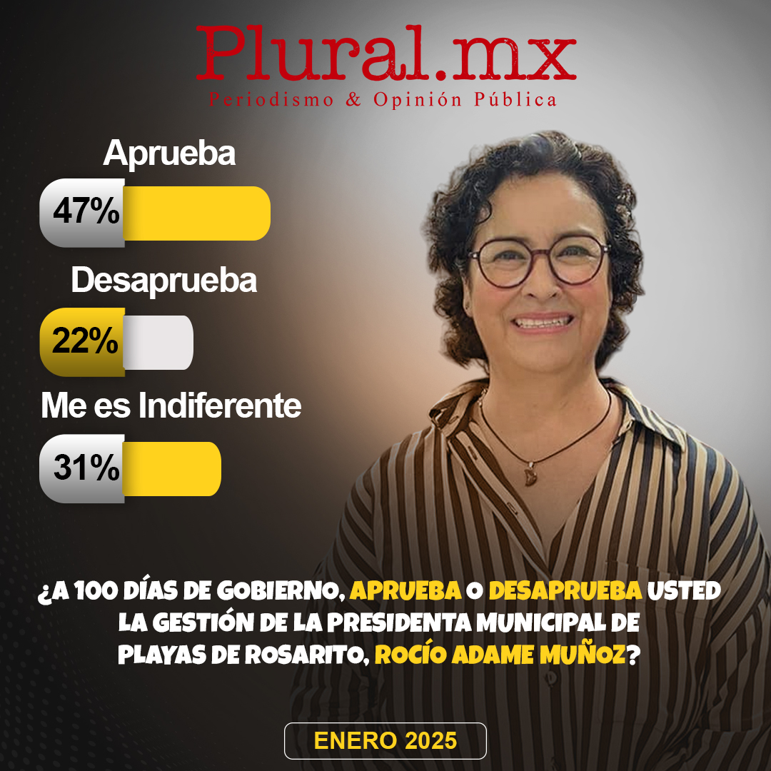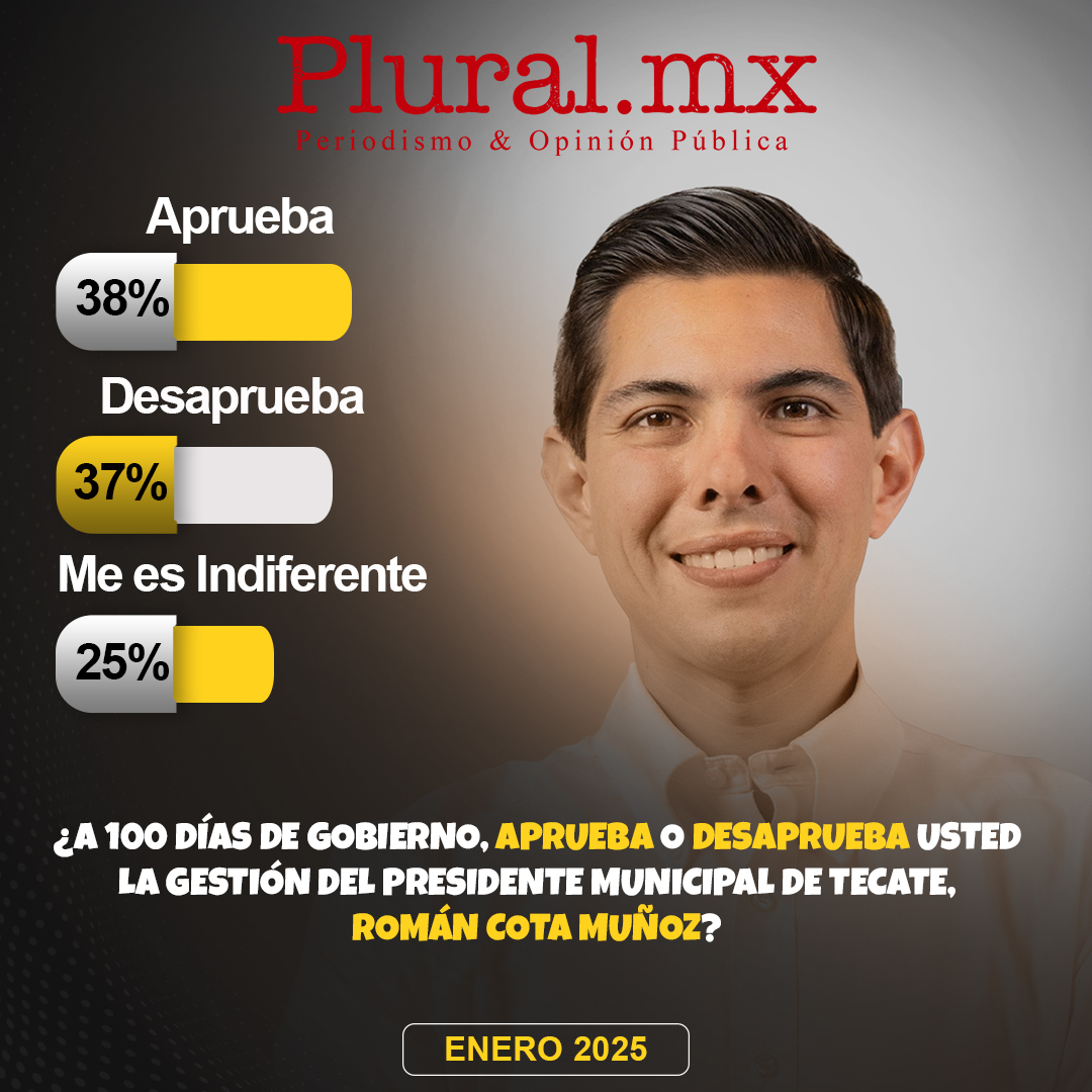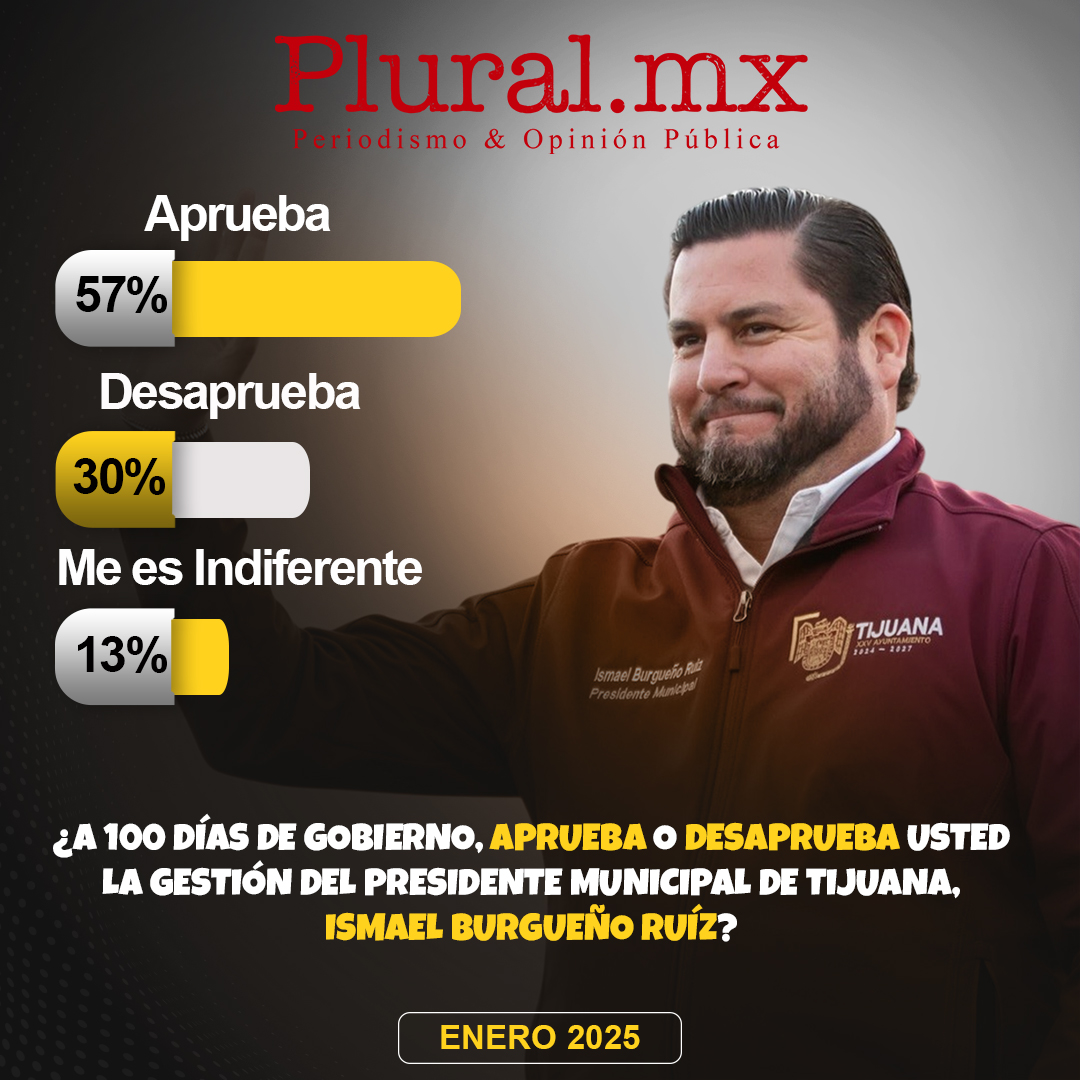 VITRINA METODOLÓGICA: El período de levantamiento se realizó entre el 12 y 18 de Enero de 2025. Universo de Estudio: Lo conformaron residentes mayores de edad de los municipios de Tijuana, Playas de Rosarito, Mexicali, Ensenada, Tecate, San Felipe y San Quintín, Baja California, con credencial de elector para confirmar domicilio y edad. Objetivo del estudio: Evaluar la gestión de los Presidentes Municipales a 100 días de su gobierno. Tamaño de Muestra: El tamaño de la muestra fue de 800 entrevistas efectivas cara a cara en cada uno de los municipios (Para un total de 5 mil 600) descartando como primer filtro a quienes no mostraron su credencial. Representatividad: El cálculo de la muestra permite un margen de error de 3.5 por ciento +/- y un nivel de confianza en el rango del 95. Técnica de muestreo: aleatorio simple, partiendo de una selección en viviendas, donde los encuestadores abordaron a la primera persona que quiso responder, dando un salto de cinco en cinco para aplicar la segunda entrevista. Responsable del estudio: Lauro Ortiz. Encuestadores: alumnos de la carrera de comunicación de la Universidad Autónoma de Baja California (UABC), campus Tijuana y Mexicali. Encuesta auspiciada por PluralMx. Programa estadístico de recolección de datos: SPSS 26.0. Diseño/Captura de datos: Félix Ayala