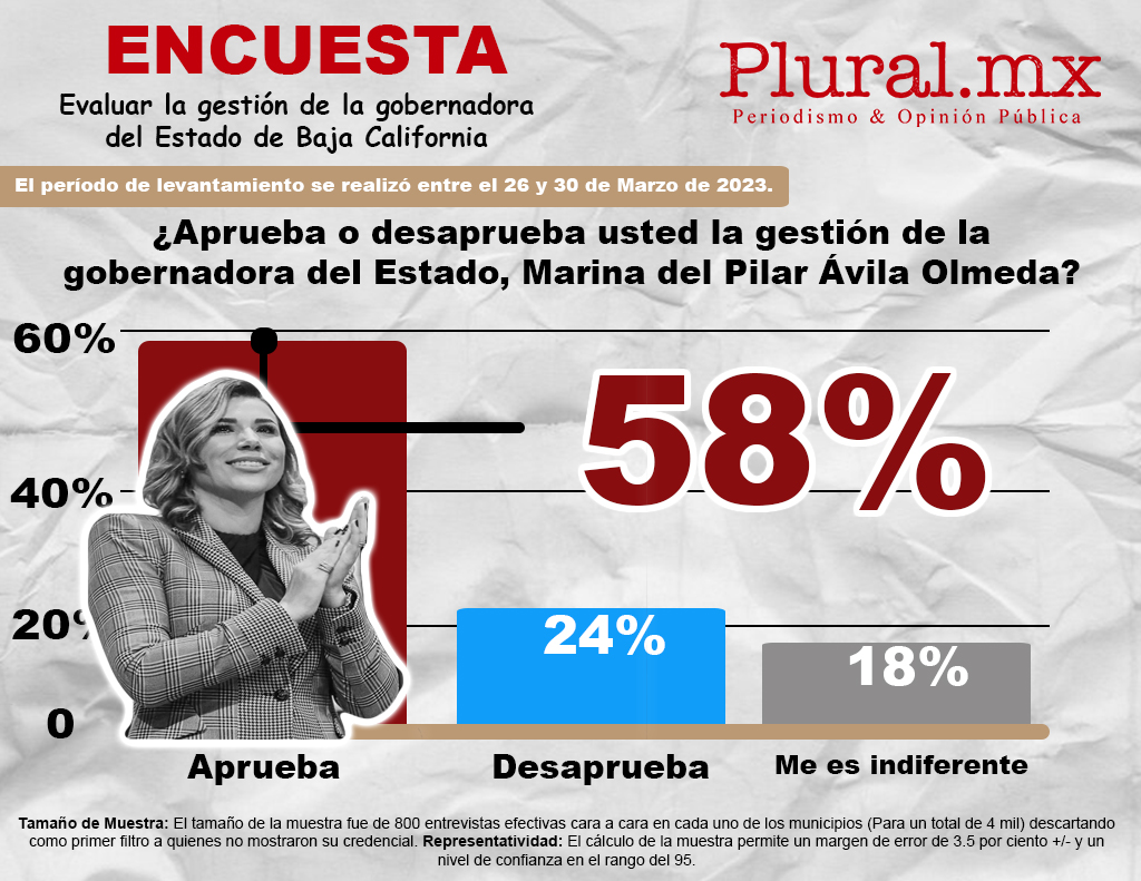 VITRINA METODOLÓGICA: El período de levantamiento se realizó entre el 26 y 30 de Marzo de 2023. Universo de Estudio: Lo conformaron residentes mayores de edad de los municipios de Tijuana, Playas de Rosarito, Mexicali, Ensenada y Tecate, Baja California, con credencial de elector para confirmar domicilio y edad. Objetivo del estudio: Evaluar la gestión de la gobernadora Marina del Pilar Ávila Olmeda. Tamaño de Muestra: El tamaño de la muestra fue de 800 entrevistas efectivas cara a cara en cada uno de los municipios (Para un total de 4 mil) descartando como primer filtro a quienes no mostraron su credencial. Representatividad: El cálculo de la muestra permite un margen de error de 3.5 por ciento +/- y un nivel de confianza en el rango del 95. Técnica de muestreo: aleatorio simple, partiendo de una selección en viviendas, donde los encuestadores abordaron a la primera persona que quiso responder, dando un salto de cinco en cinco para aplicar la segunda entrevista. Responsable del estudio: Lauro Ortiz Aguilera. Encuestadores: alumnos de la carrera de comunicación de la Universidad Autónoma de Baja California (UABC), campus Tijuana y Mexicali. Encuesta auspiciada por PluralMx. Programa estadístico de recolección de datos: SPSS 26.0. Diseño/Captura de datos: Félix Ayala