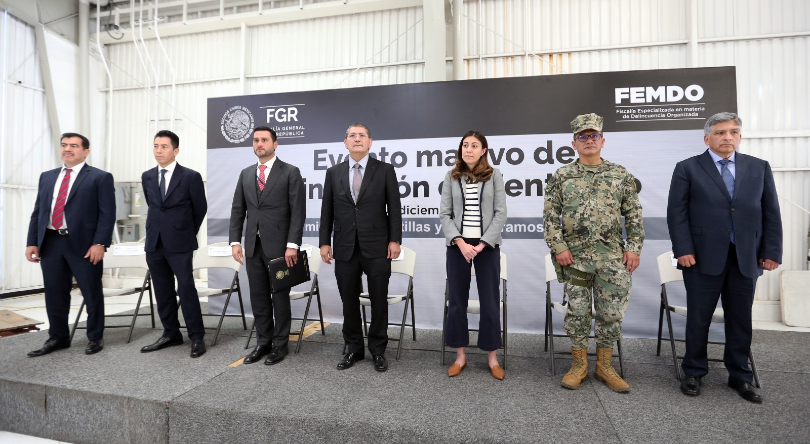 El acto se llevó a cabo en las instalaciones del hangar de la FGR del Estado de México, con la asistencia de Rocío Zamudio, Agregada Adjunta en nuestro país del Departamento de Justicia de Estados Unidos América, Contralmirante de Infantería de Marina, Diplomado de Estado Mayor, Lic. Jesús López Trujillo, Delegado Estatal de la FGR en el Estado de México, así como el Titular de la Unidad Especializada en Investigación de Terrorismo, Acopio y Tráfico de Armas y el Titular de la Unidad Especializada en Investigación de Delitos Contra la Salud, ambos de la FEMDO.