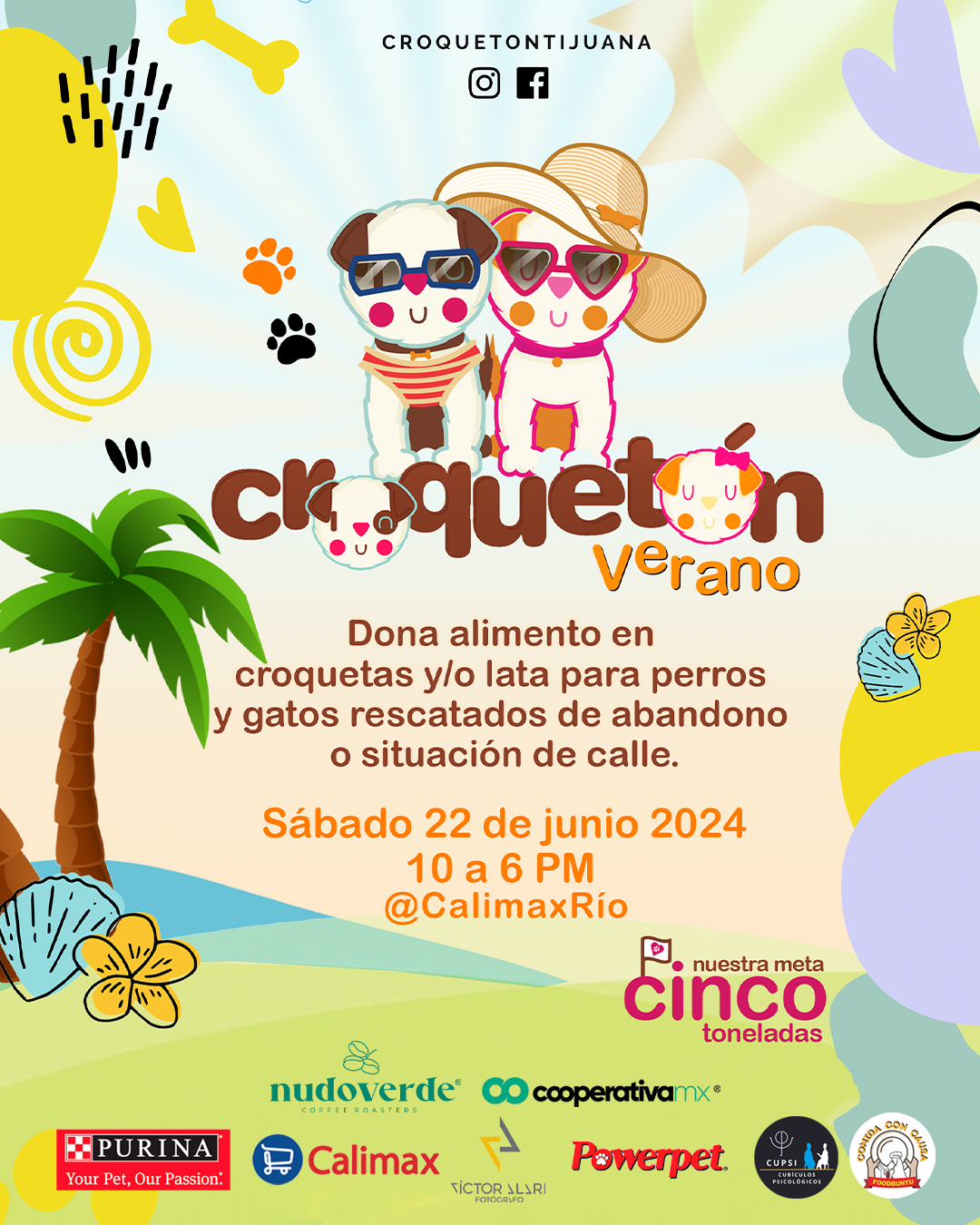 Tijuana BC 12 de junio de 2024.-Con el fin de apoyar el sostenimiento de 13 agrupaciones de rescate de perros y gatos de condiciones de maltrato y abandono con una población de 890 perros y 230 gatos, este próximo sábado 22 de junio se llevará a cabo una edición más del evento Croquetón Tijuana en el estacionamiento de Calimax Río.